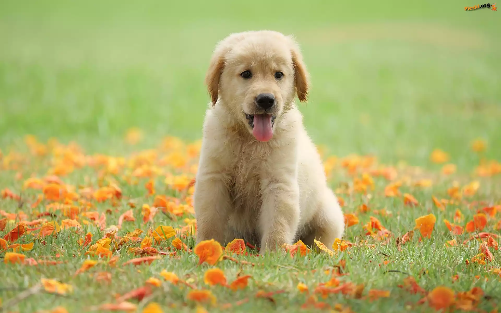 Łąka, Golden retriever, Szczeniak, Jęzor, Liście, Pieski