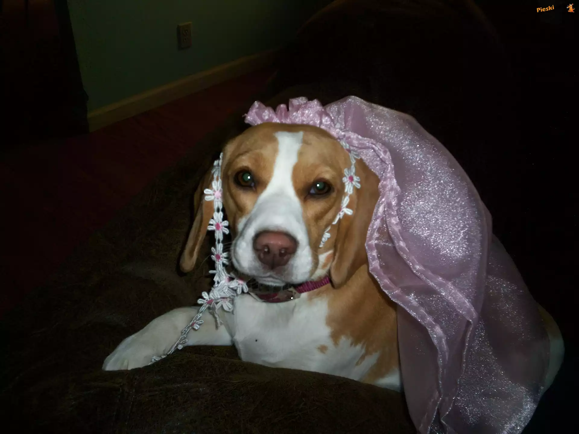 Beagle Harrier, różowy, welon Beagle Harrier, żółte, kwiatki