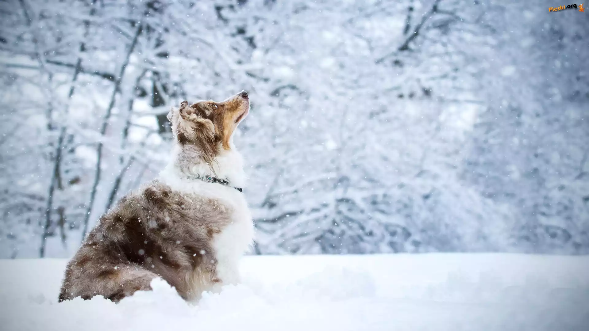 Drzewa, Pies, Owczarek australijski, Śnieg, Pieski