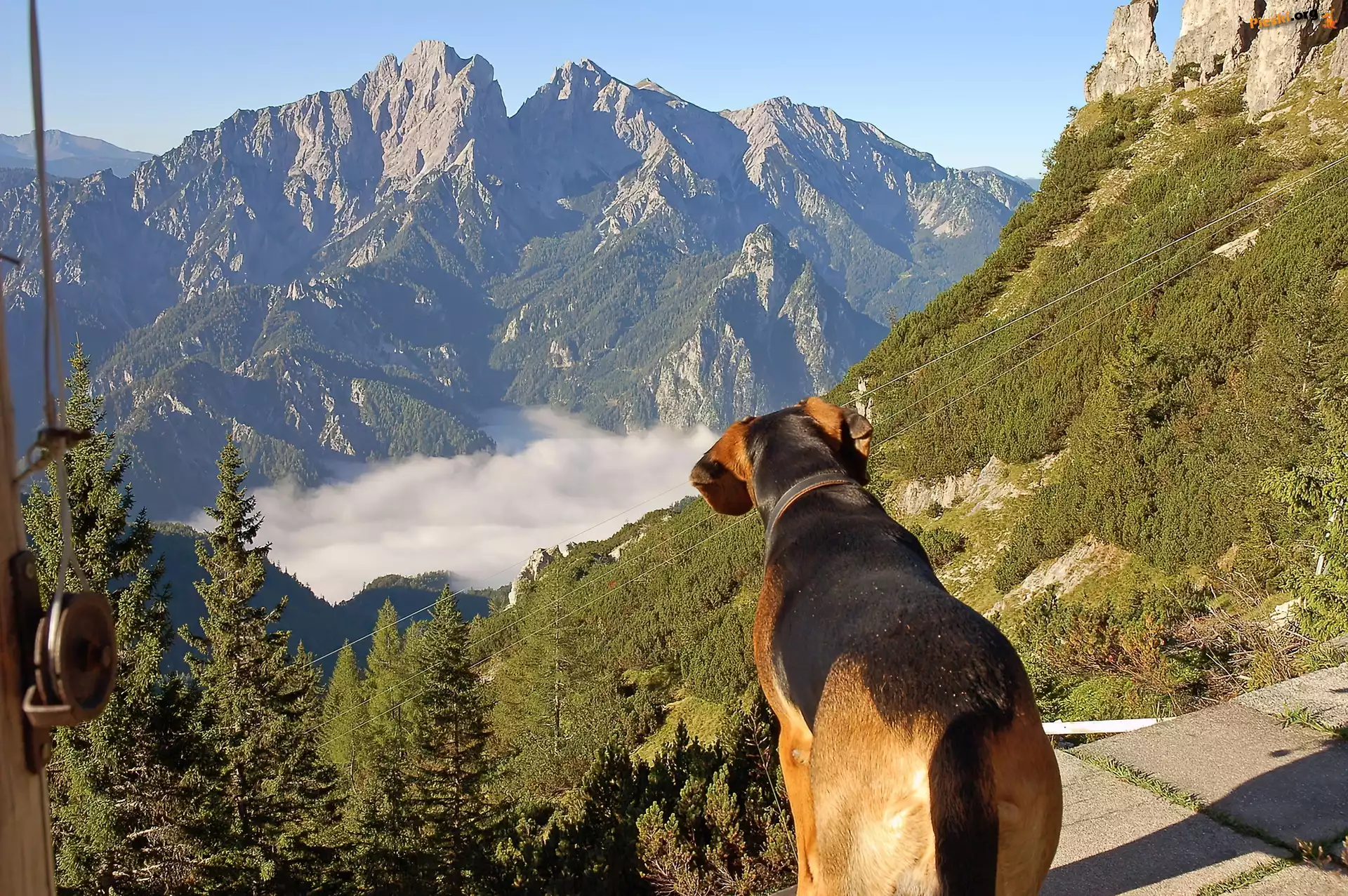 Drzewa, Góry, Mgła, Piesek, Pieski