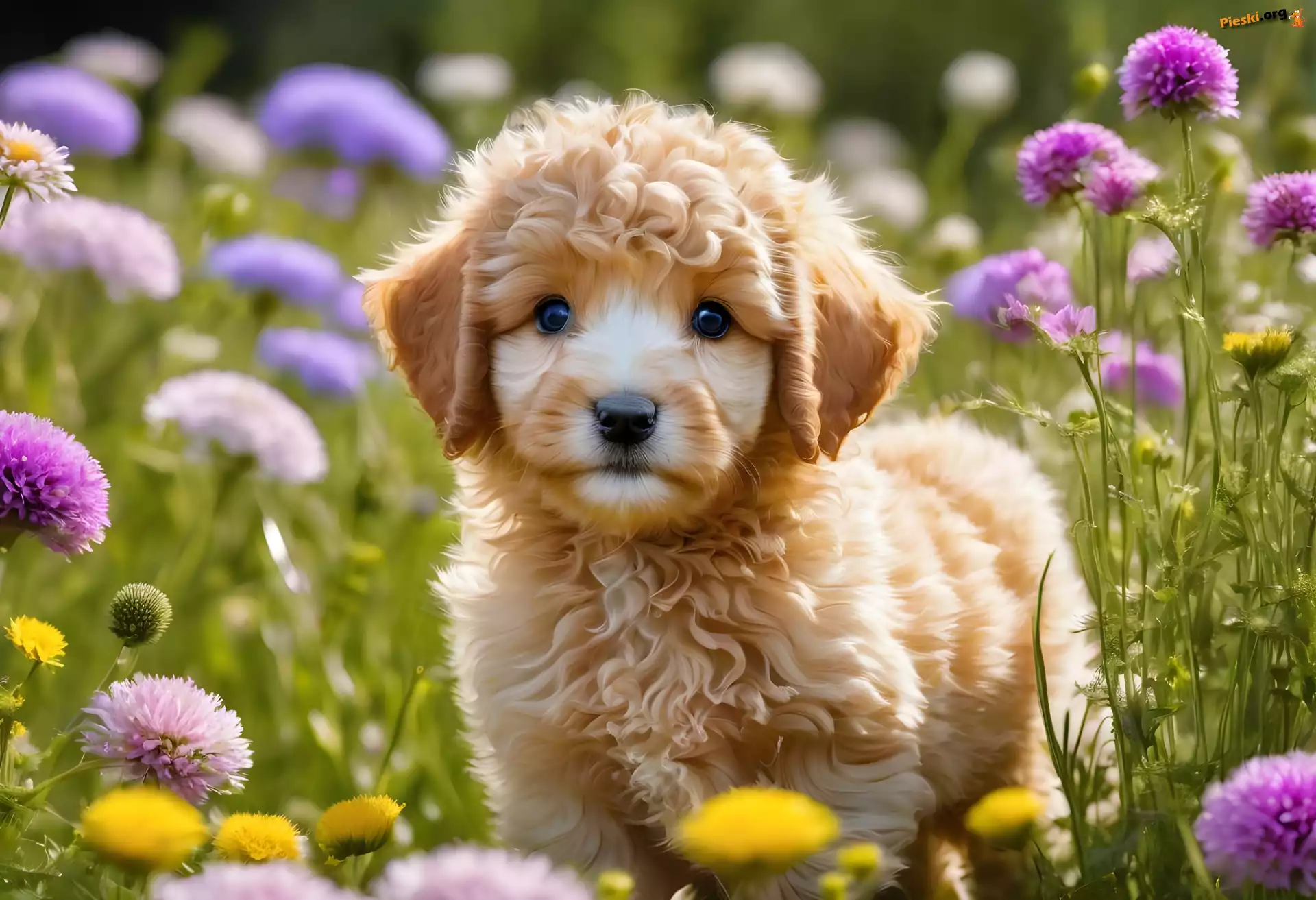 Kwiaty, Grafika, Pies, Łąka, Szczeniak