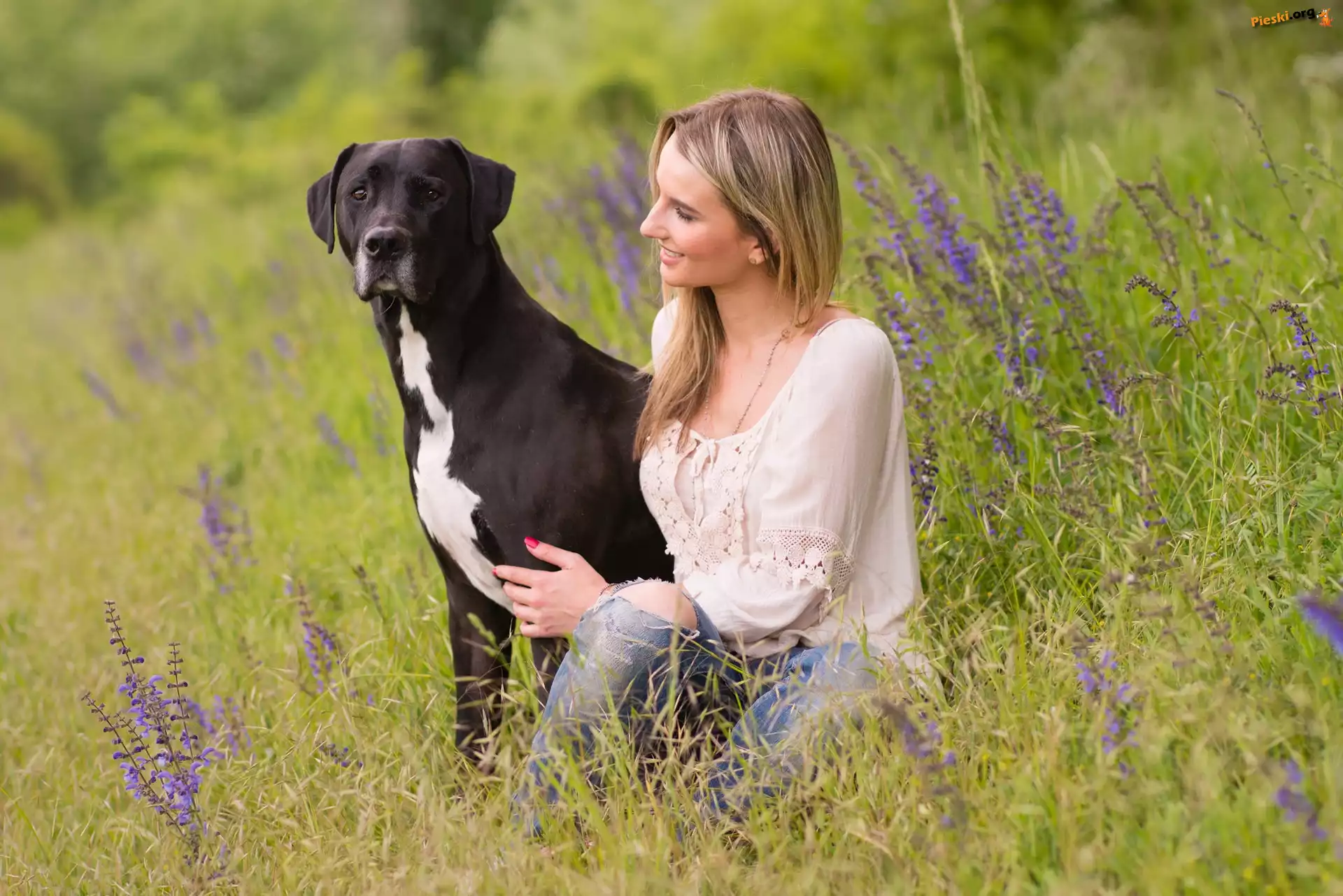 Łąka, Pies, Kobieta, Kwiaty, Pieski