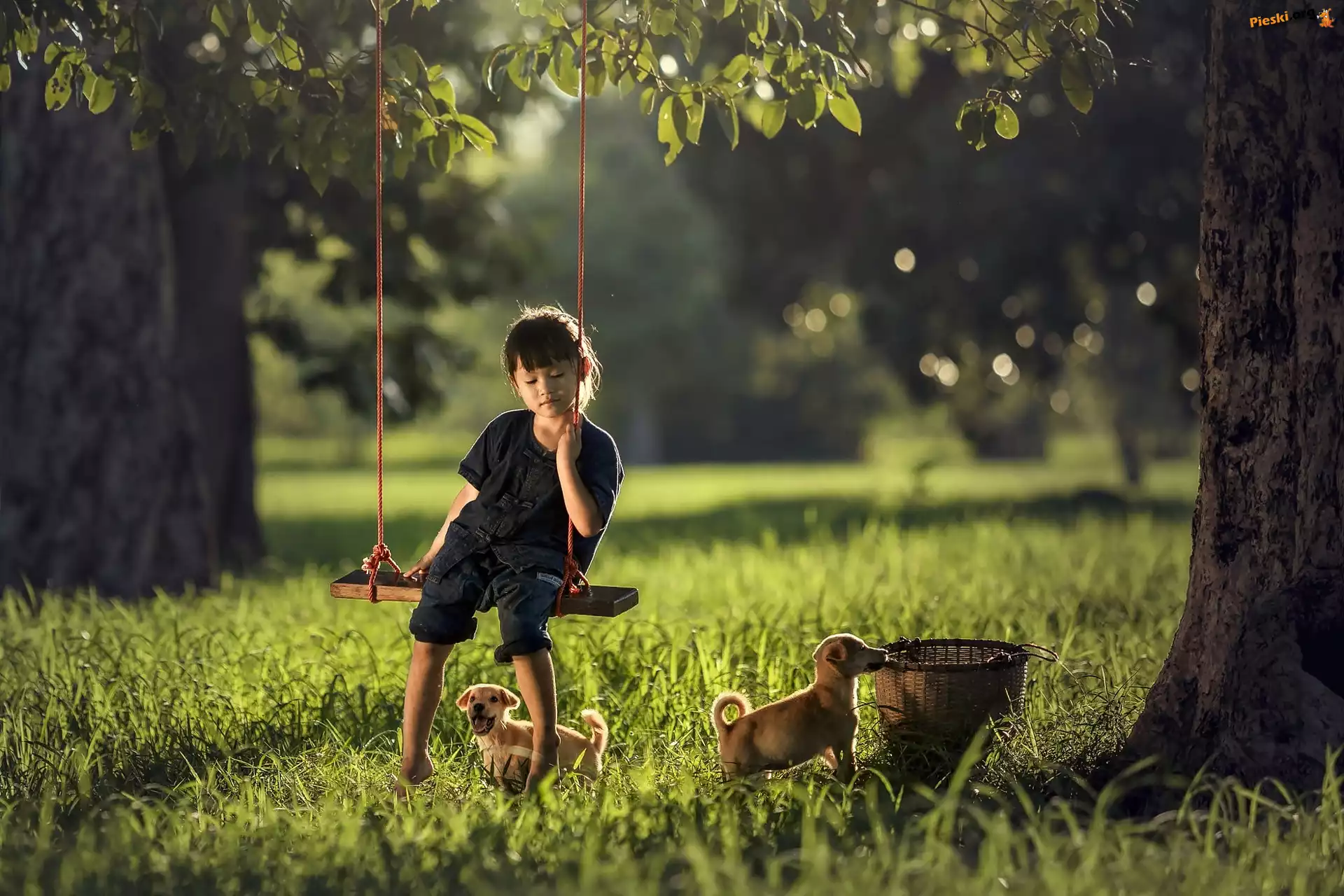 Kosz, Huśtawka, Dziewczynka, Szczeniaczki, Park, Pieski