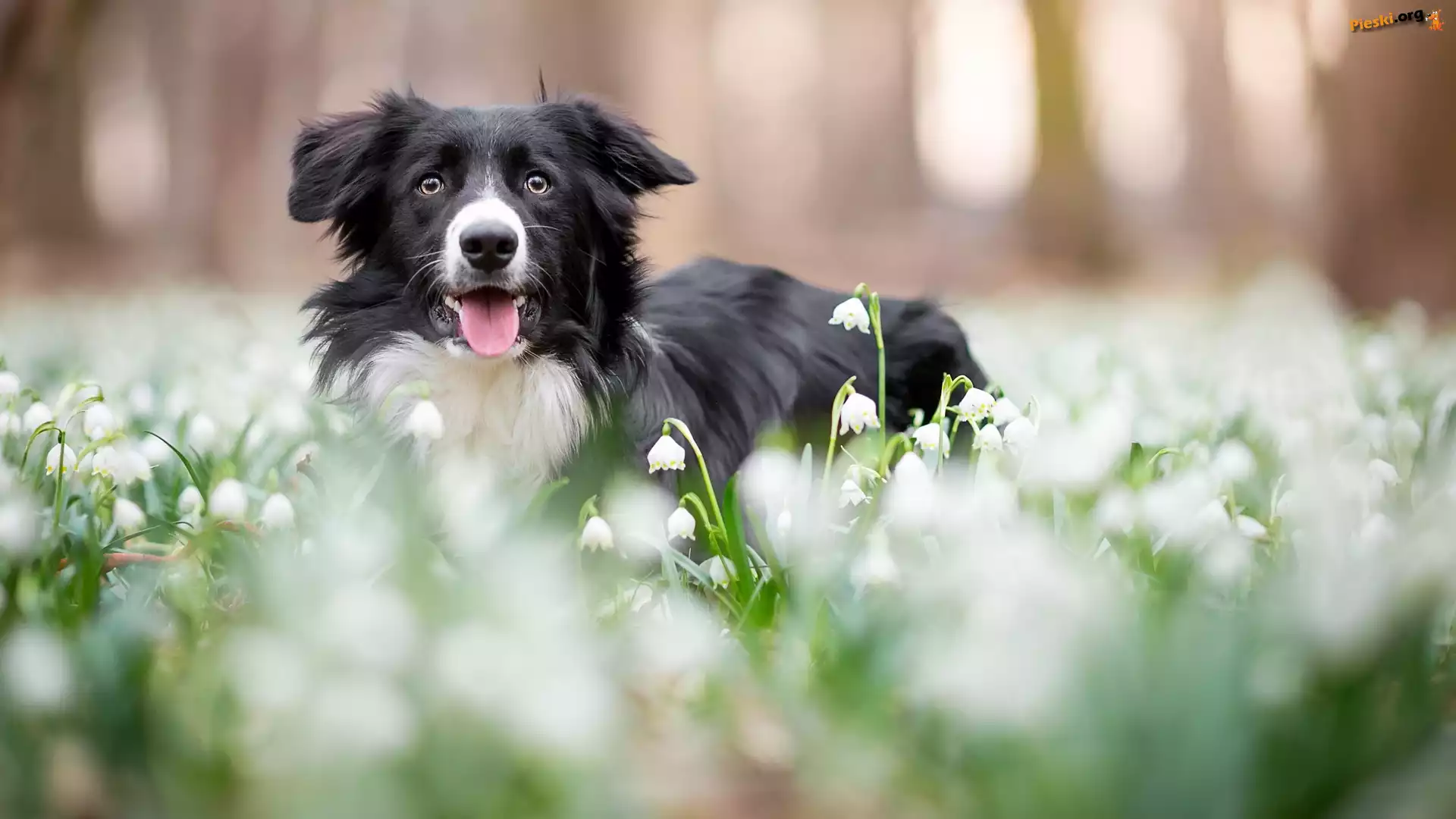 Pies, Kwiaty, Łąka, Border collie, Mordka, Śnieżyce