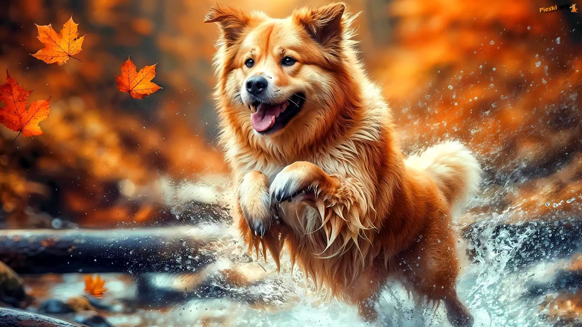 Woda, Liście, Grafika, Jesienne, Pies, Pieski