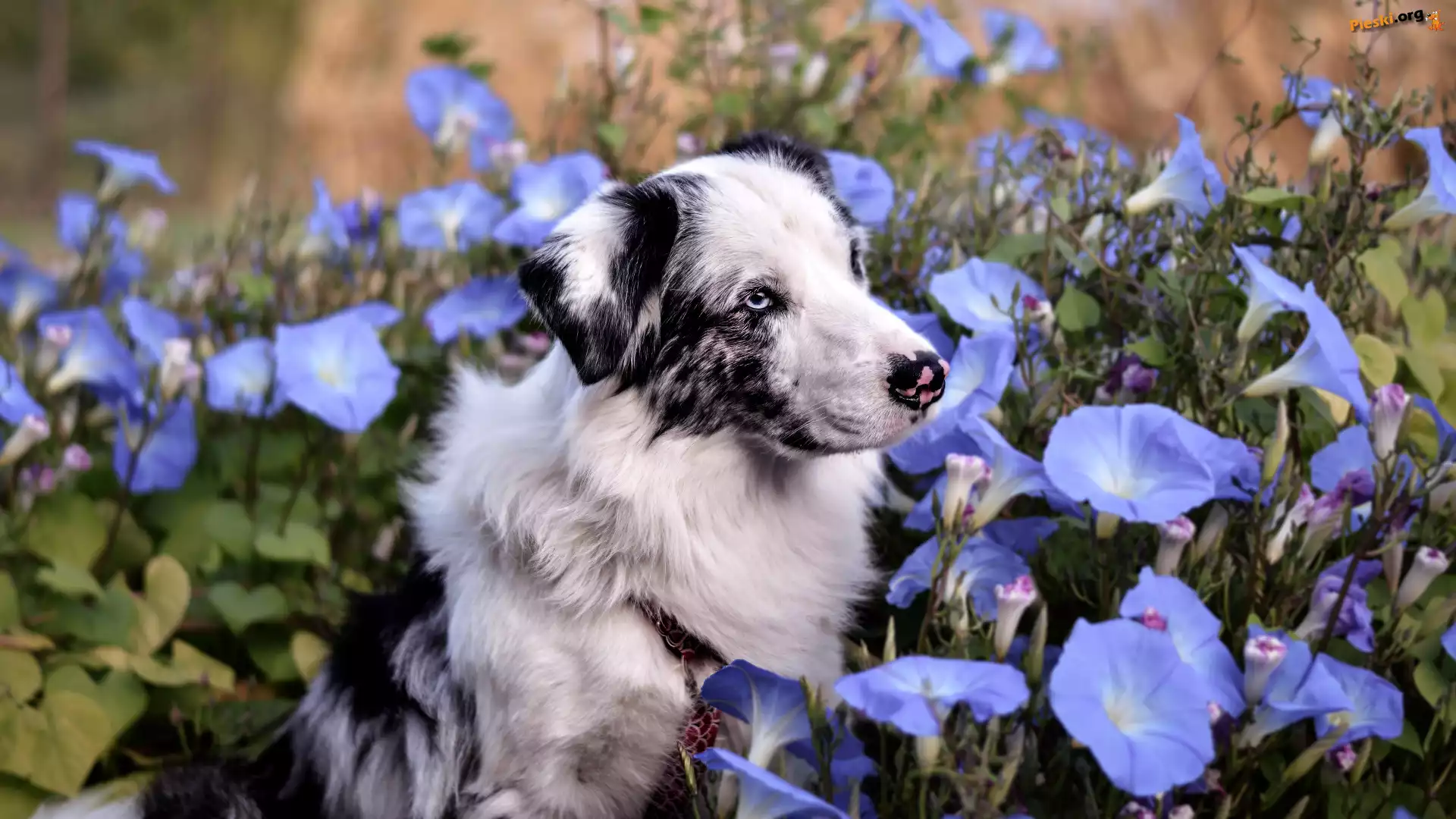 Niebieski, Owczarek australijski, Pies, Kwiaty, Powój