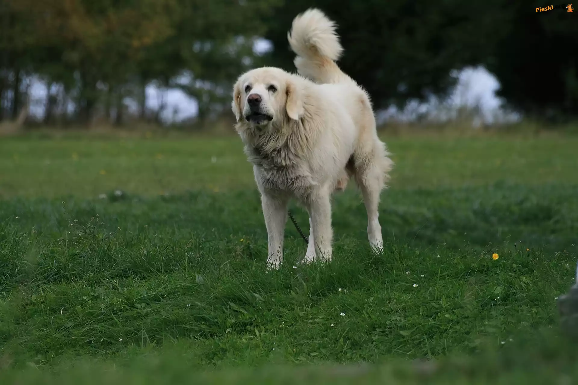 Biały, Polski owczarek podhalański, język czerwona, Owczarek podhalański, zęby, obroża Pies, Owczarek Podhalański skórzana, Głowa, Owczarka podhalańskiego, obroża Biały, mały, piesek Owczarek podhalański, zielona, trawa Trawa, Dwa, Pieski, Niebo Mordka, Polskiego owczarka podhalańskiego
