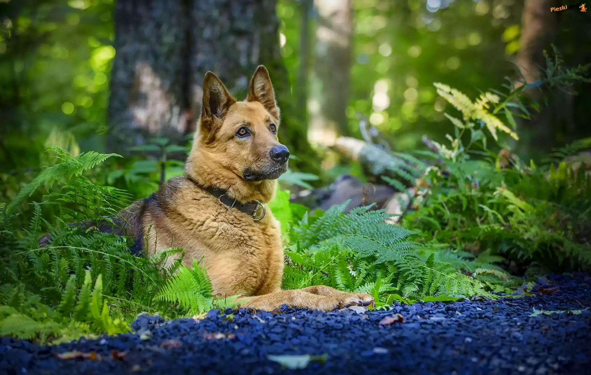 Paprocie, Pies, Owczarek niemiecki, Las, Pieski