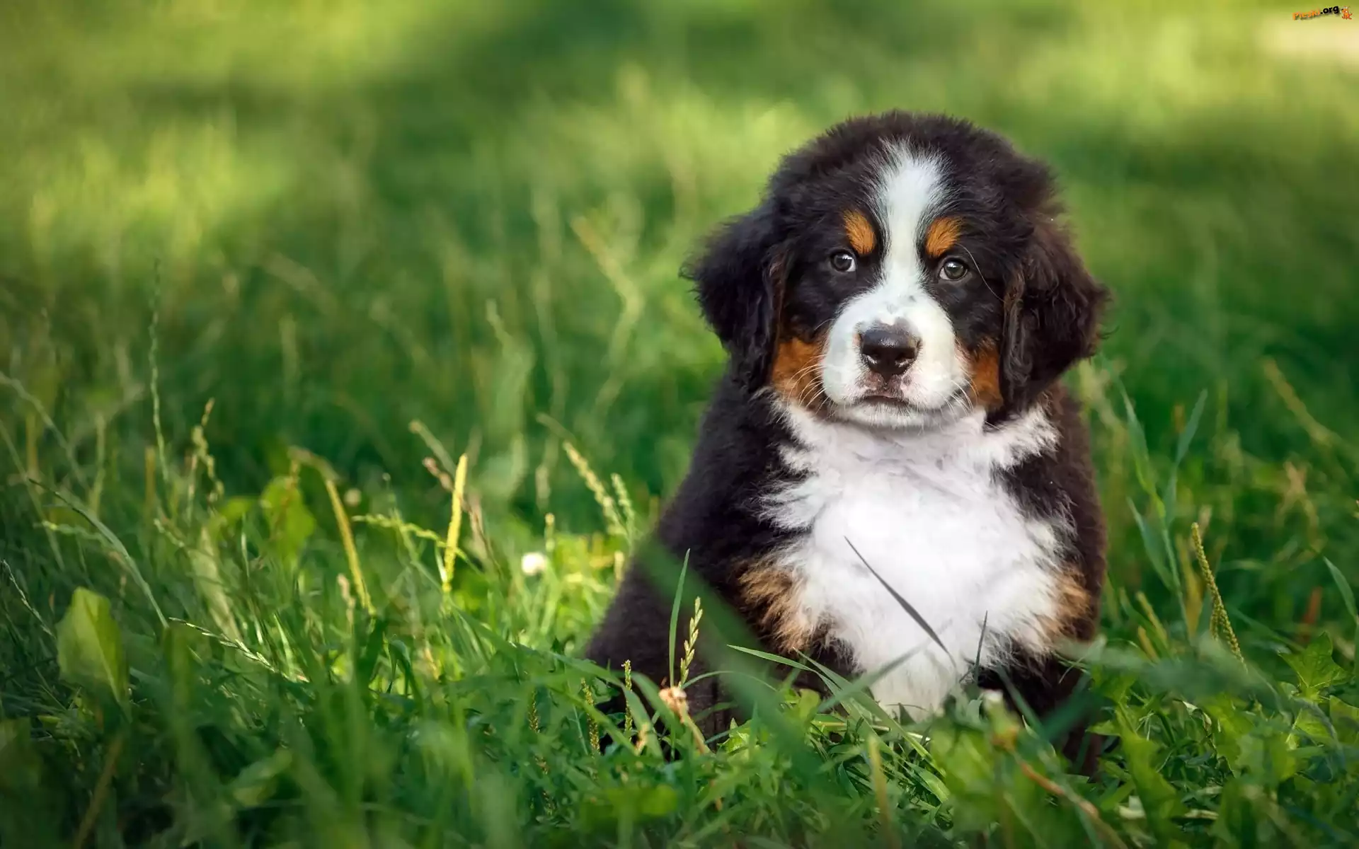 Pasterski, Berneński, Szczeniaczek, Pies, Łąka, Pieski
