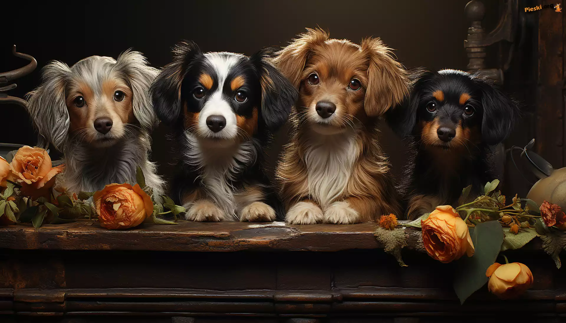 Szczeniaki, Róże, Cztery, Kwiaty, Psy