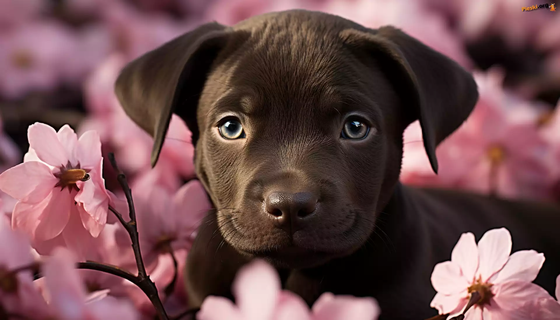 Różowe, Kwiaty, Pies, Szczeniak, Pieski