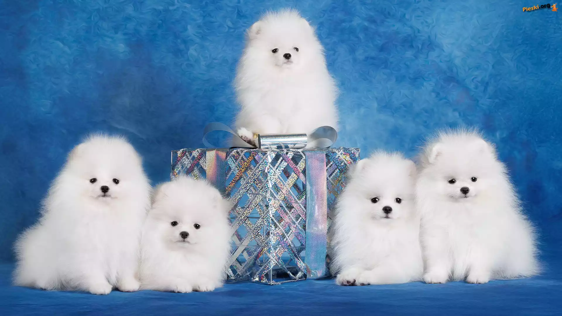 Białe, Prezent, Psy, Szpice miniaturowe, Szczenięta, Pieski