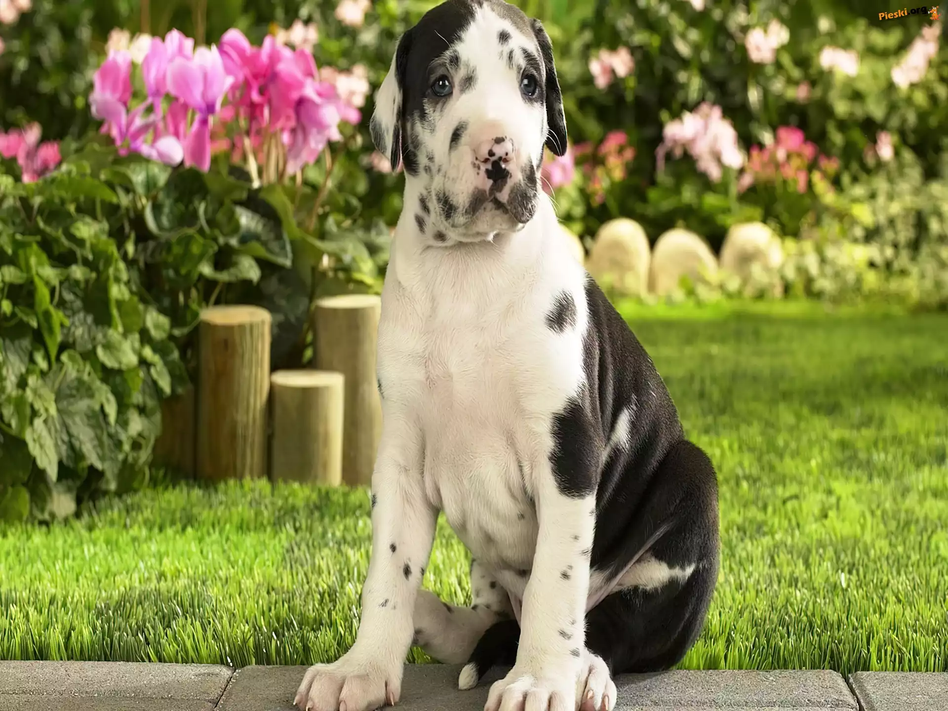 Trawa, Dog, Młody, Niemiecki, Kwiaty, Pieski
