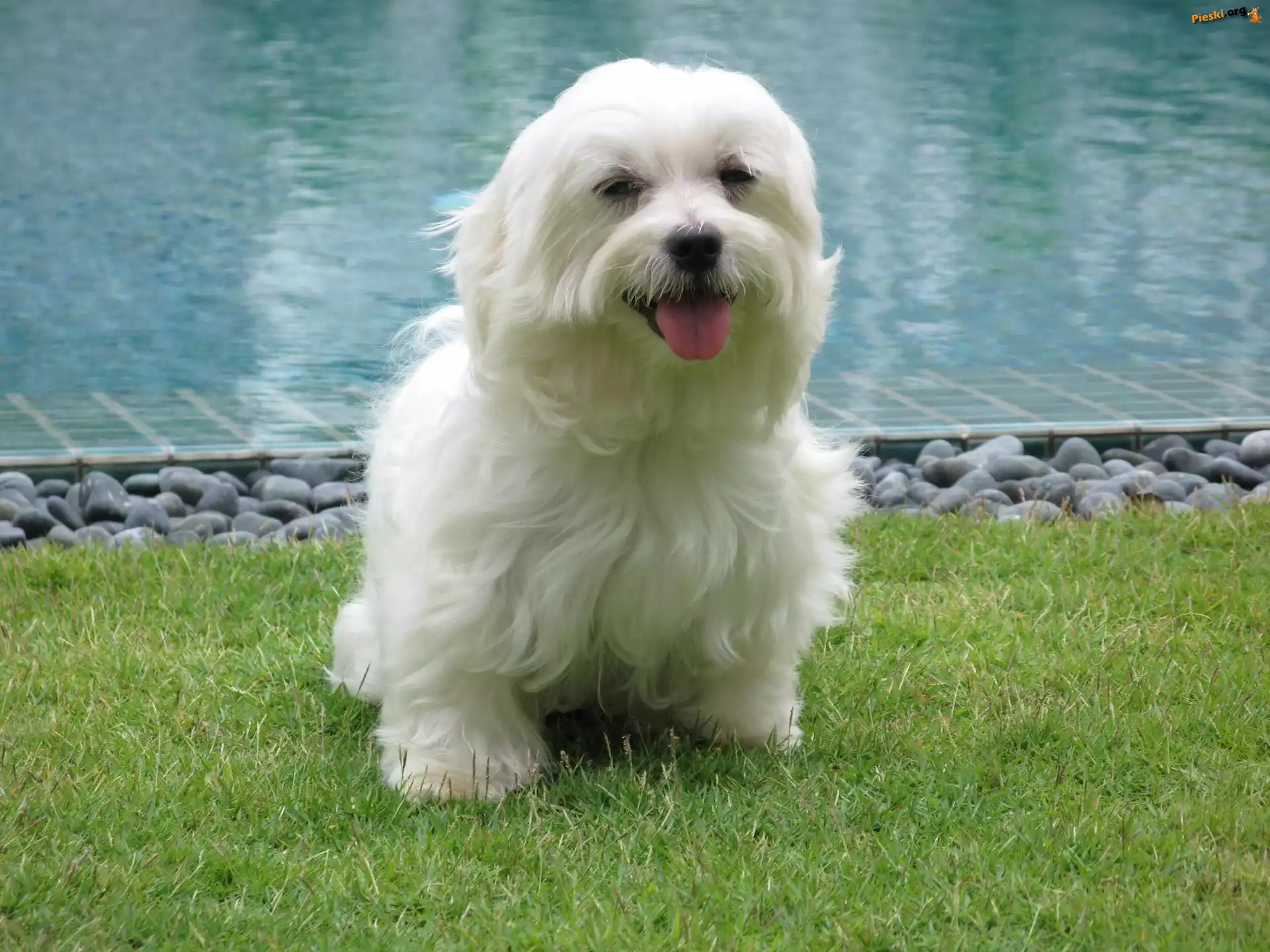 Biały, Coton de Tulear Kokardka, Coton de Tulear, Piesek Szczeniak, Biały, Pies, Coton de Tulear Coton de Tulear, fotel Dwa, Coton de Tulear Trawa, Biały, Piesek, Basen Młoda, Kobieta, Pies Piesek, Coton de Tulear, Łąka