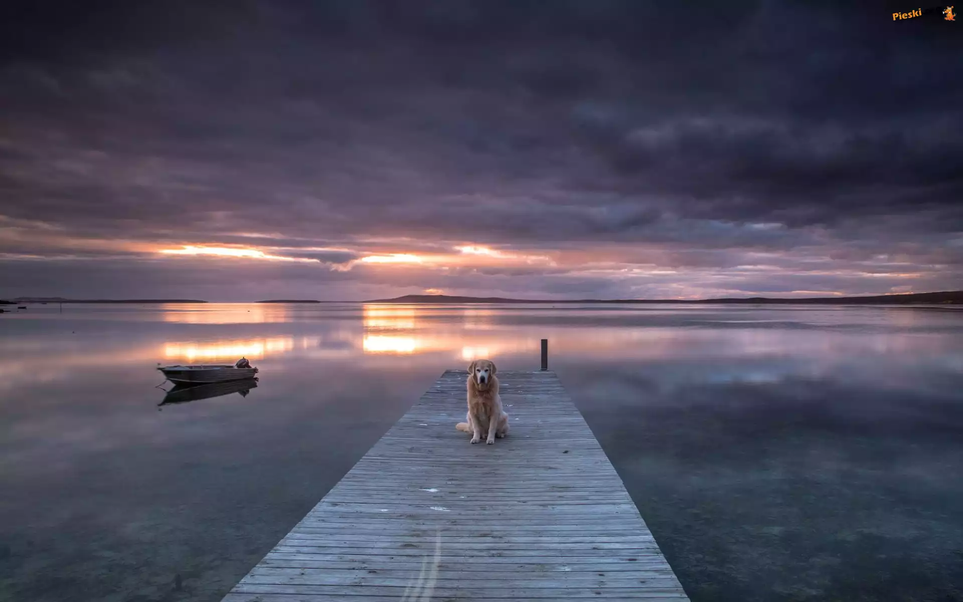 Łódka, Morze, Pies, Zachód słońca, Pieski
