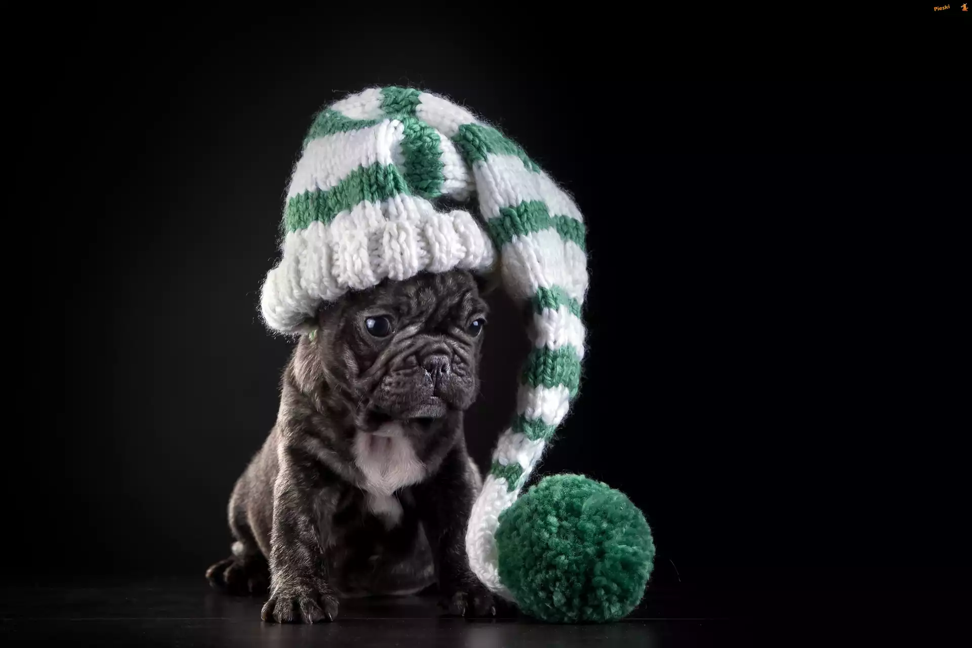 Czapka, Pies, Pompon, Szczeniak, Buldog francuski, Zimowa, Dzianina